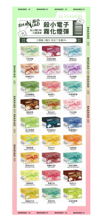 芭樂, 老冰棍, 青蘋果, 冰橙, 草莓牛奶, 百香果, 葡萄, 超級冰, 冰紅茶, 沙士, 薄荷, 煙草, 藍莓, 可燊, 鐵觀音, 蜜桃, 西瓜, 荔枝, 寶礦力, 檸檬海鹽, 芒果, 紅酒, 哈密瓜, 檸檬餅亁, 蜂蜜柚子茶, 茉莉花茶, 奇異果, 彩虹糖
