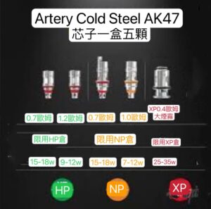 Artery Cold Steel AK47 提供多款不同的霧化芯,滿足各種吸煙需求。根據不同的瓦數和電阻選擇,適合不同的口感和煙霧量需求。