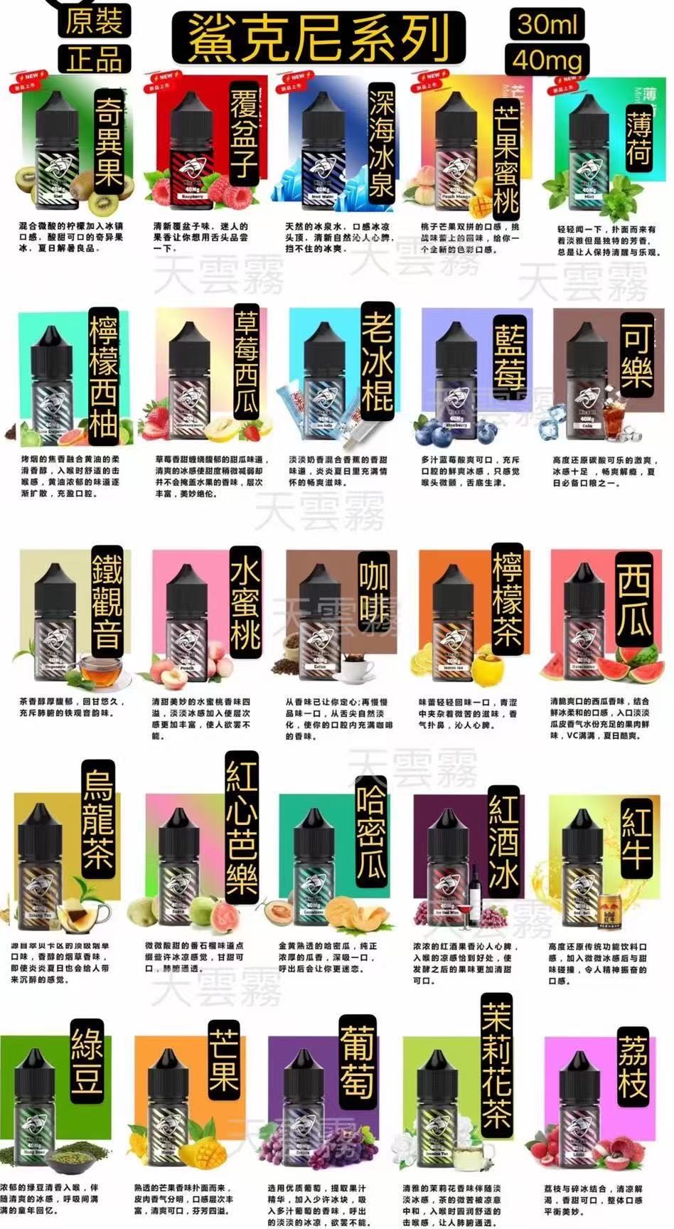 純純冰露, 紅冰西柚, 蘇桃蘇打, 白葡萄汁, 橘子梅冰, 芒果蜜桃, 寶礦力, 拿鐵, 覆盆子, 冰泉, 奇異果, 薄荷, 檸檬西柚, 老冰棍, 藍莓, 可樂, 鐵觀音, 蜜桃, 西瓜, 清香烏龍茶, 芭樂, 哈密瓜, 紅酒冰, 紅牛, 綠豆, 芒果, 葡萄, 茉莉花, 荔枝, 草莓奶昔, 百香果, 香草雪碧, 冰紅茶, 綠冰, 紫冰, 橙冰, 鳳梨冰, 批發10瓶起私談, 批發款