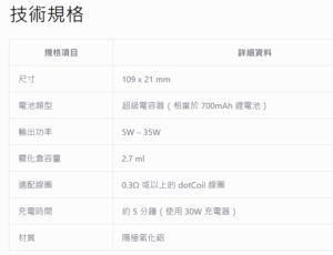 多功能輸出:支援 5W 至 35W 輸出範圍,適用於 MTL(口吸)和 DTL(直肺吸)模式,兼容 0.3Ω 及以上的 dotCoil 線圈。