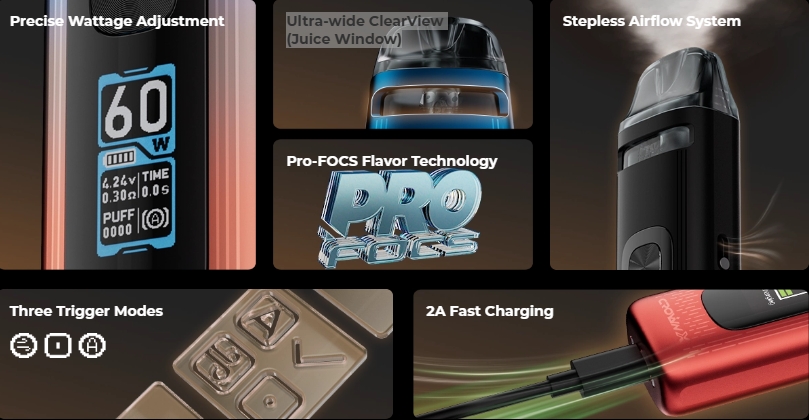 - 科技加持:PRO-FOCS 風味檢測技術,讓您每一口蒸氣都濃郁飽滿。
