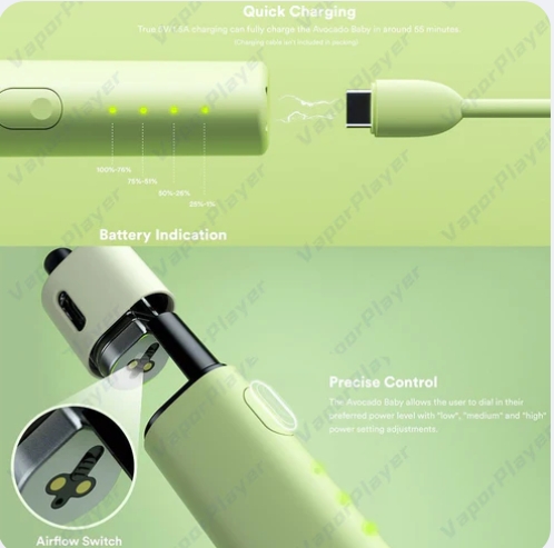 VAPTIO Avocado Baby 酪梨寶寶是一款小巧便攜的電子煙設備,專為隨身攜帶和方便使用而設計。採用適合初學者的風格,操作簡單。該設備由 1100mAh 內建充電電池供電,最大功率輸出為 22W,並配有易於使用的一鍵選單系統,方便調整功率。